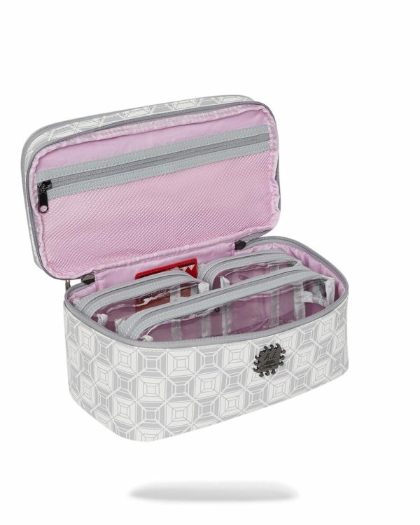 Bottom opening incLudes 3 clear removable pouches for makeup, beauty product organization