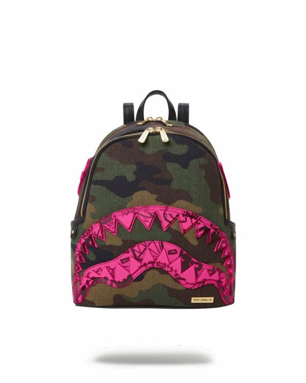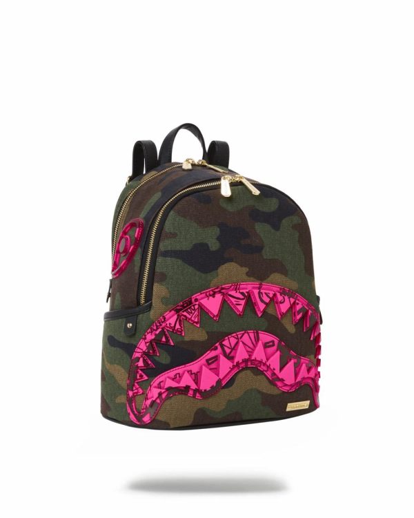 Dimensions: 10″ x 5″ x 11.5″ • Rubber Shark Mouth Two large main zippered compartments • Side pockets • Zippered Stash pocket • Adjustable straps for custom sizing • Gold zippers with metal hardware