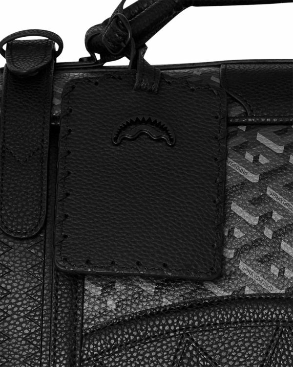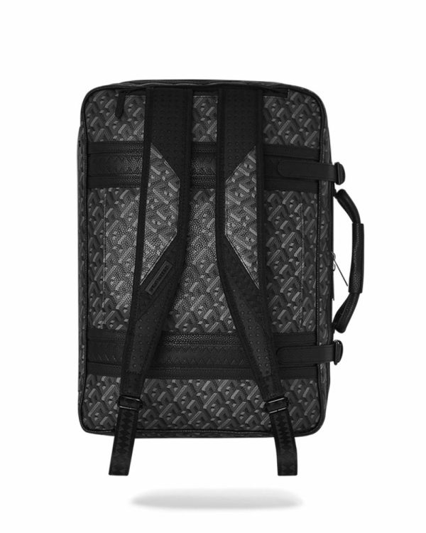 Features: Leather handle, secure buckle closure, whip stitching features, vertical sharkmouth embossed details, converts from backpack to handheld briefcase, embossed sharkmouth, includes luggage tag, 2 exterior zipper pockets, luggage sleeve, 4 interior mesh pockets, large interior pocket, clothing compression straps, includes adjustable backpack straps, embossed zipper pulls.