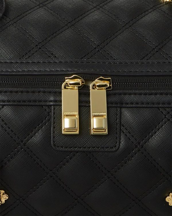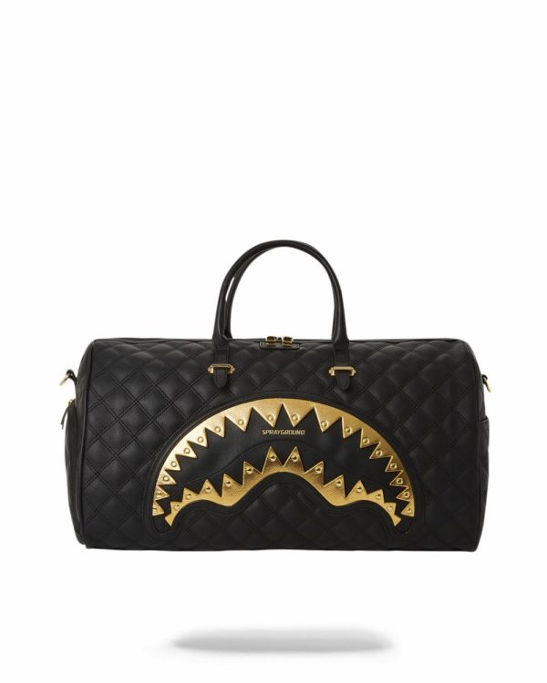 Sophisticated quilted faux leather collection. Accented with metallic gold shark mouths and nail head hardware details.